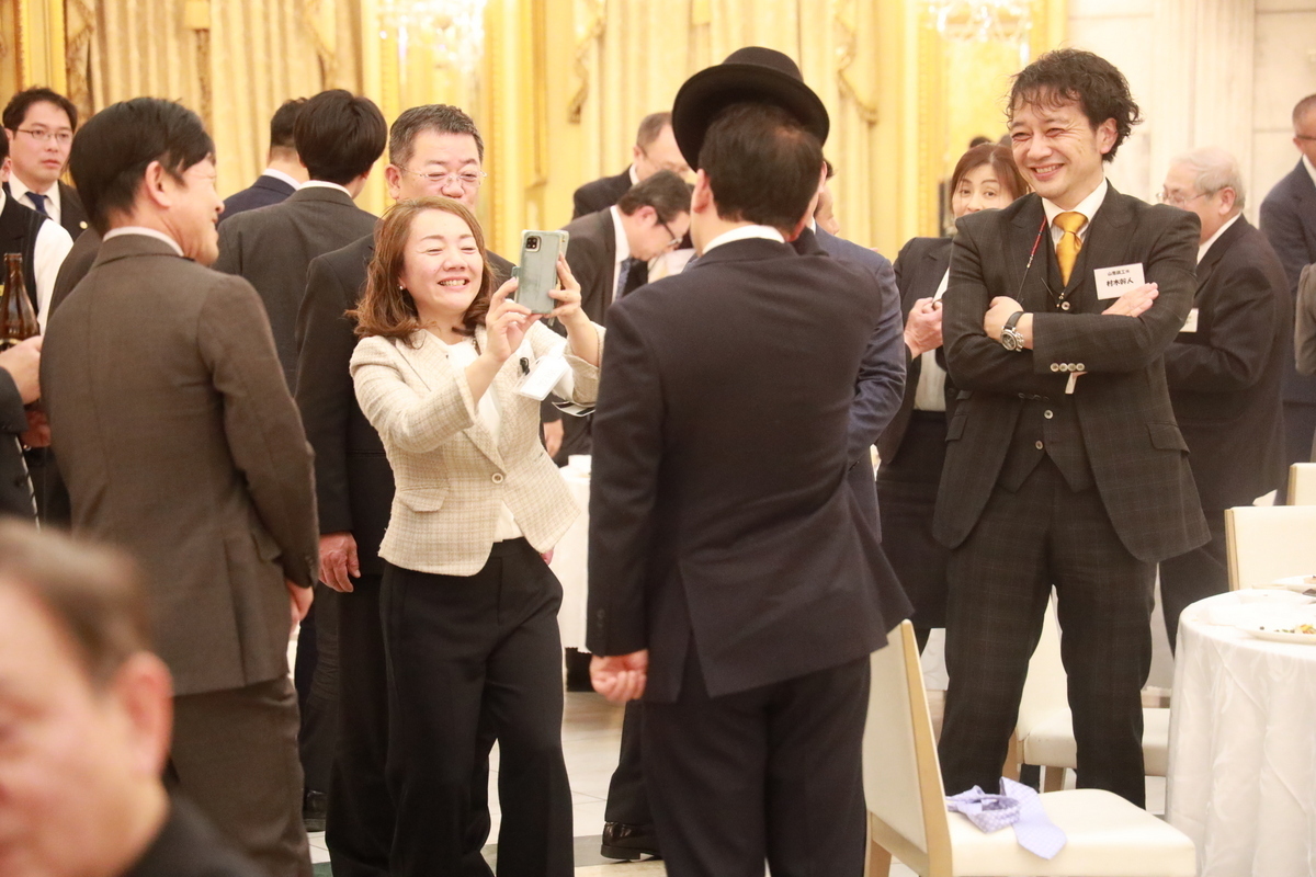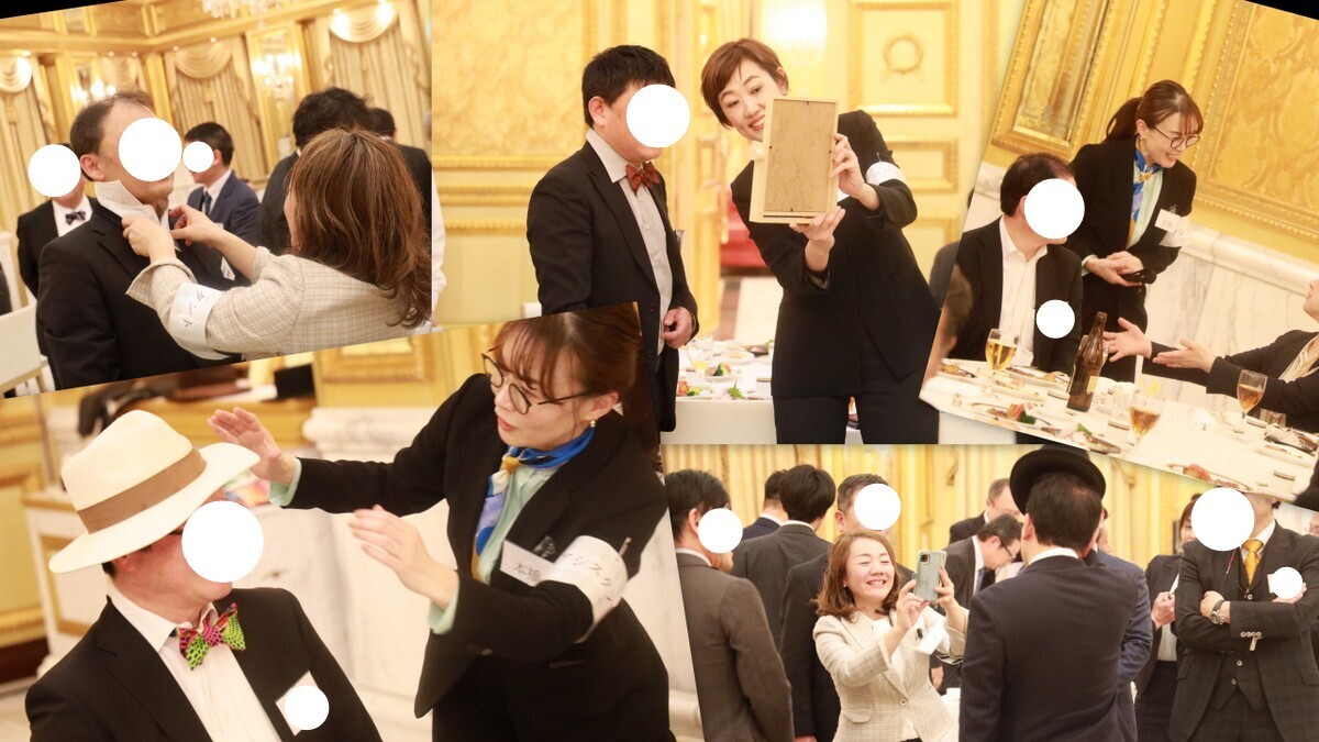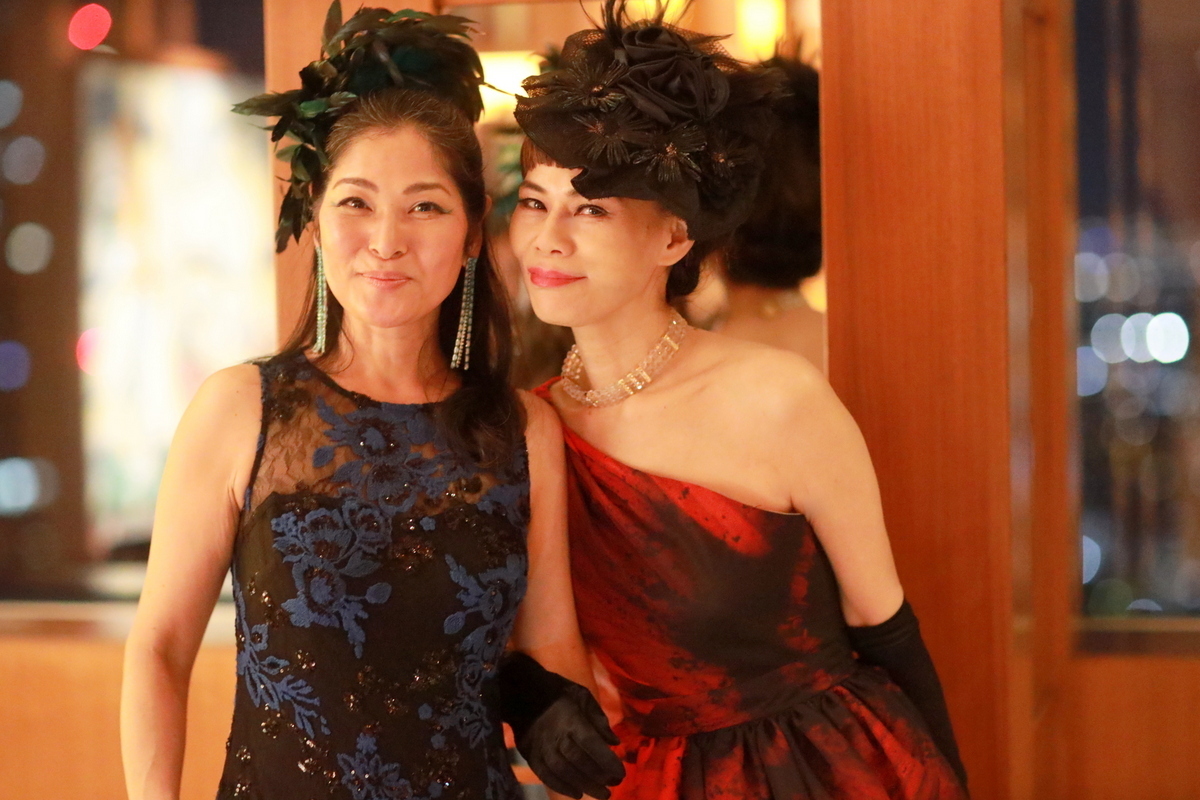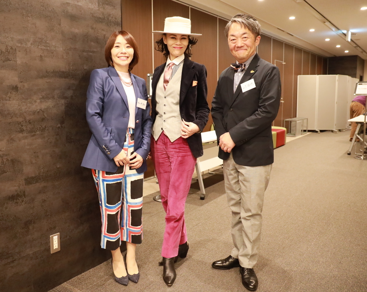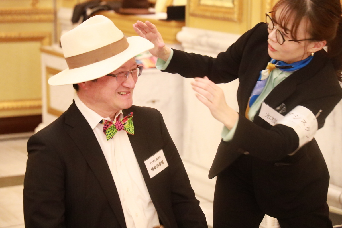 授業ではメンズファッションの基本にも触れますが、蝶ネクタイの正式名称はボゥタイ。出来合いのものしか知らないという人が95%といわれる日本。ボルタイは付けるものではなく結ぶもの。そのことを知るだけでも目から鱗!とボゥタイの魅力を体感されるシーンは圧巻です。美しい所作で、紳士3人のネックラインを華やかに仕上げることができた。座卓だけでなく、実践も重要視しています。